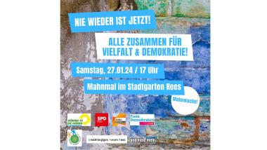 22.01.2024 Mahnwache gegen Rassismus und Antisemitismus am 27.01.24 / 17:00 Uhr Rees, weltoffen und demokratisch Mehr dazu